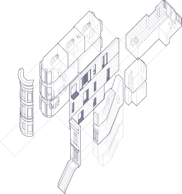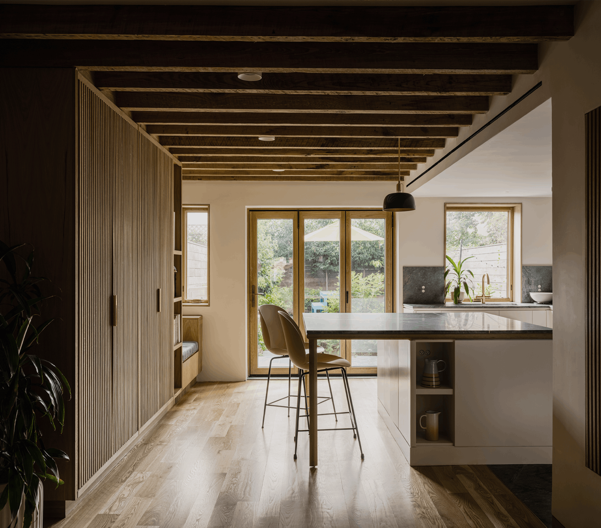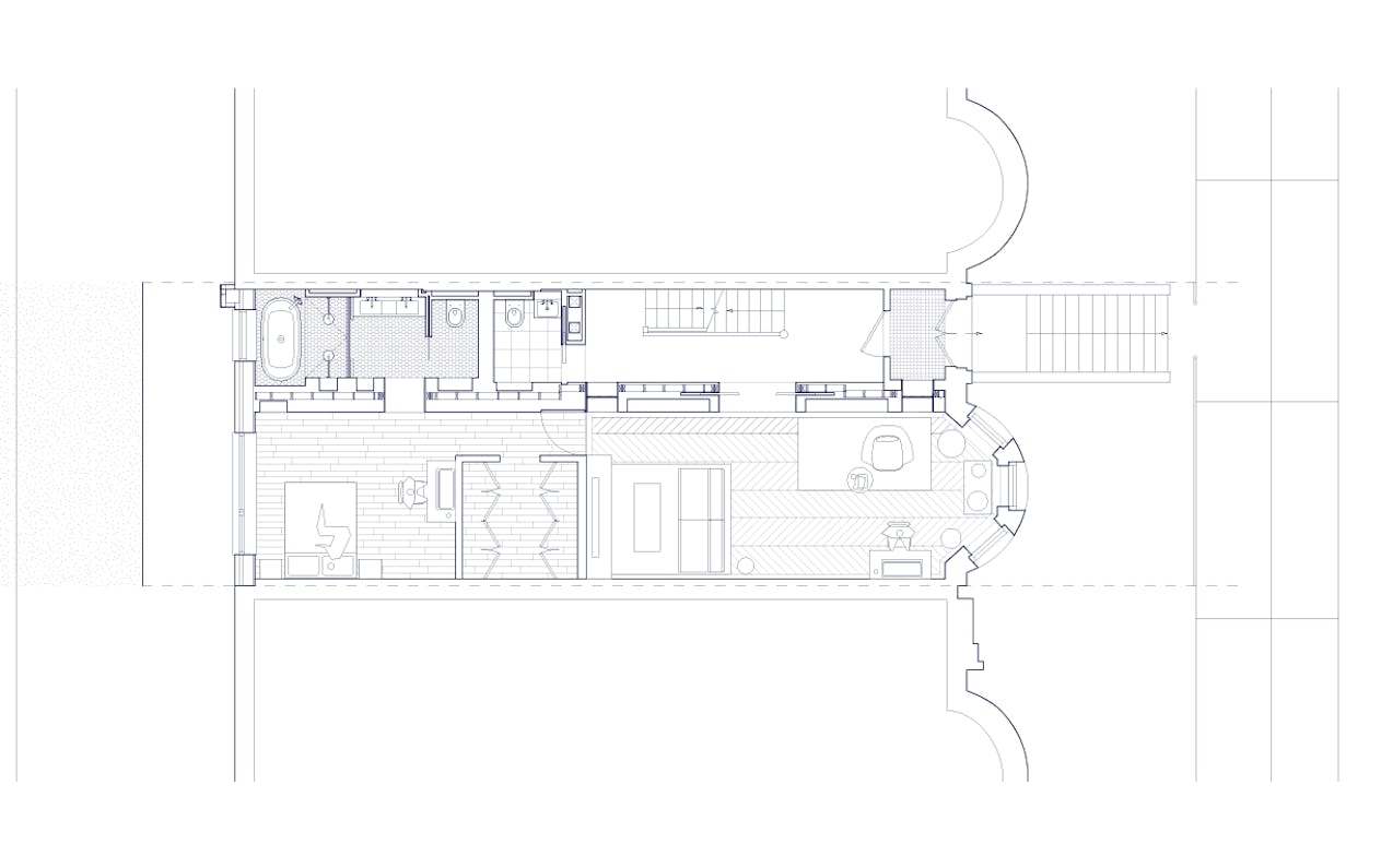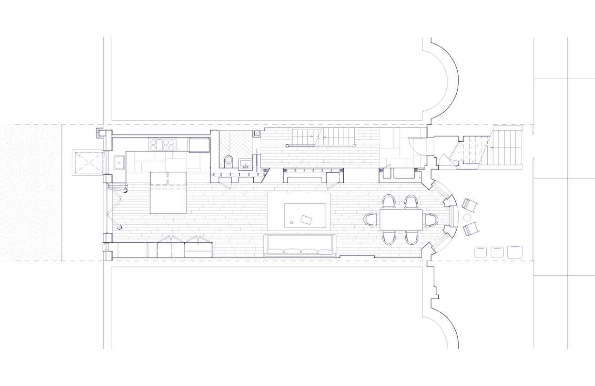 The material palette—white oak, plaster, exposed brick, and glass—creates warmth through restraint rather than excess. Each element serves both functional and compositional purposes: the oak provides continuity, the plaster offers a soft backdrop for daily life, and the preserved structural elements remind us of the home's layered history. This is architecture that doesn't announce itself but rather reveals its intelligence through use—spaces that adapt to morning homework sessions, afternoon gatherings, and evening retreats. Located on a quiet Brooklyn street, the project demonstrates that meaningful density comes not from building higher but from building smarter. Through subtle moves and careful craft, this townhouse proves that the most radical act might be choosing normalcy over spectacle.