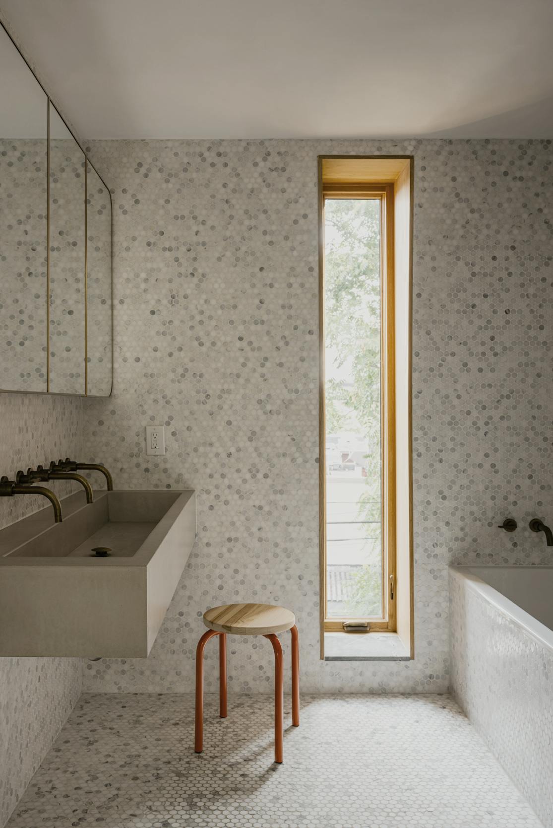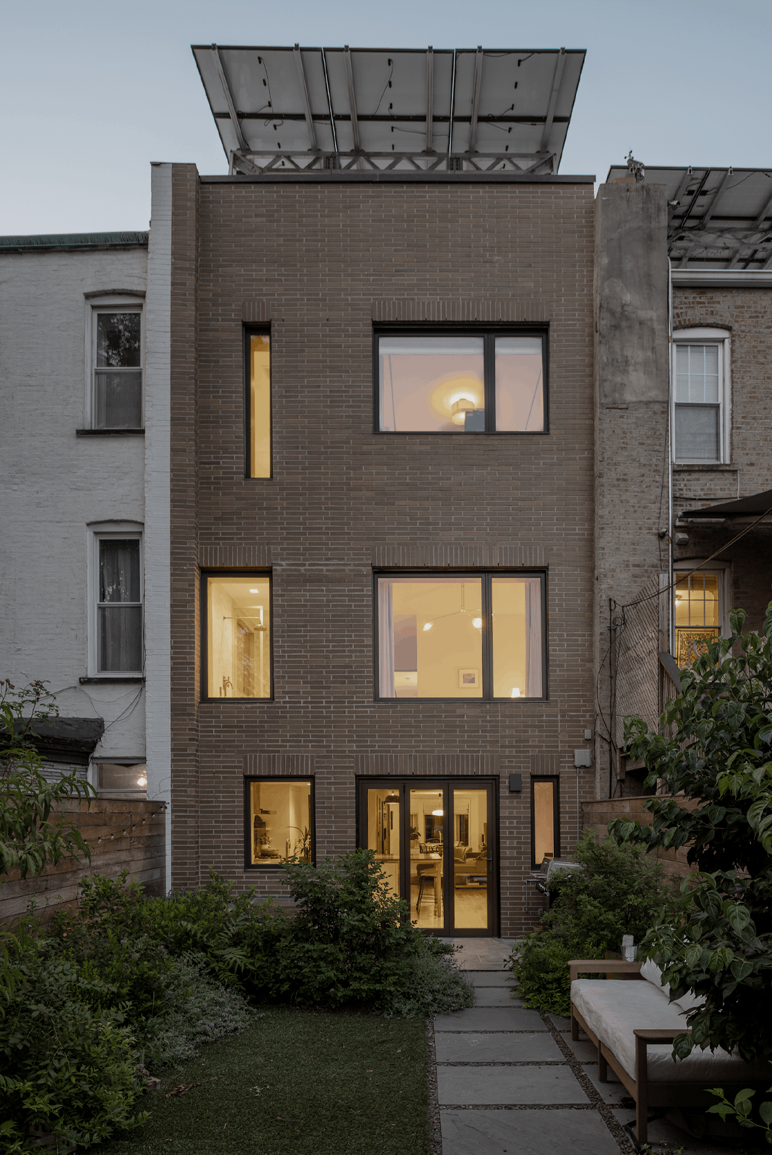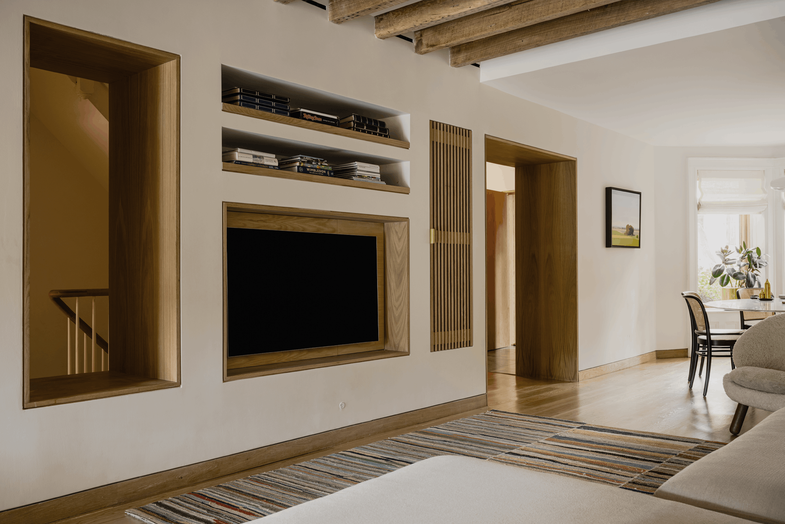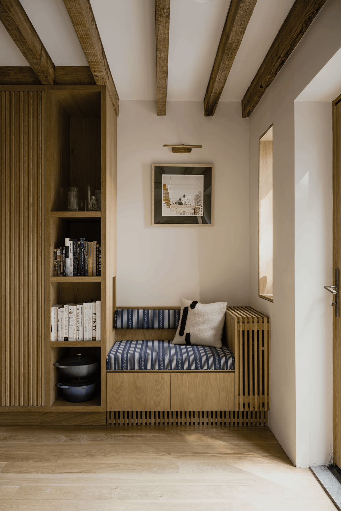 The material palette—white oak, plaster, exposed brick, and glass—creates warmth through restraint rather than excess. Each element serves both functional and compositional purposes: the oak provides continuity, the plaster offers a soft backdrop for daily life, and the preserved structural elements remind us of the home's layered history. This is architecture that doesn't announce itself but rather reveals its intelligence through use—spaces that adapt to morning homework sessions, afternoon gatherings, and evening retreats. Located on a quiet Brooklyn street, the project demonstrates that meaningful density comes not from building higher but from building smarter. Through subtle moves and careful craft, this townhouse proves that the most radical act might be choosing normalcy over spectacle.
